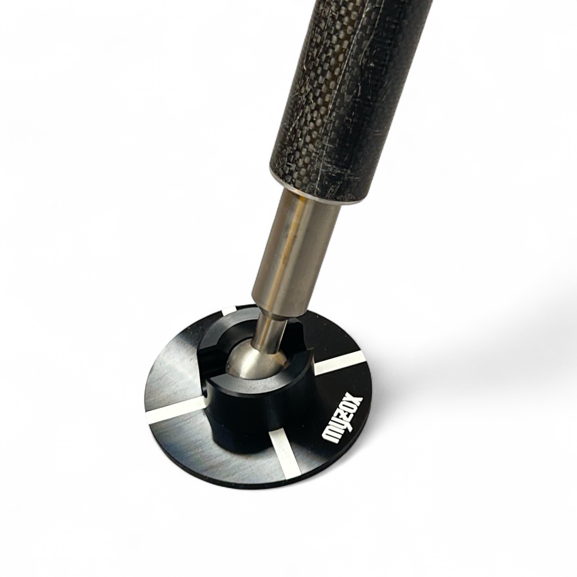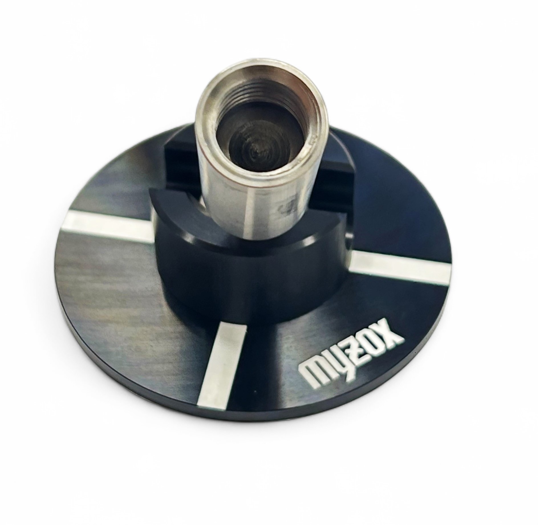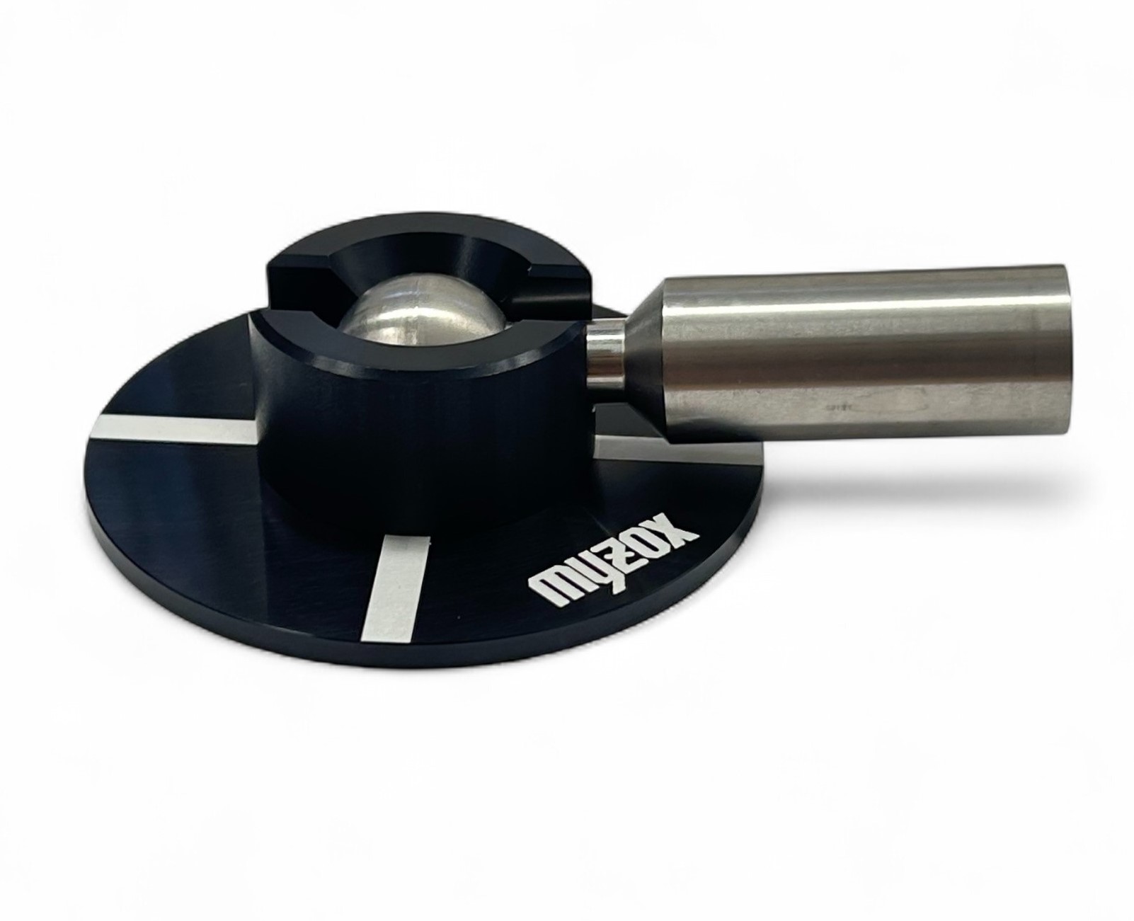 Hrot na tyčku s podstavcem a otčným adaptérem od firmy Myzox. Umožňuje tyčku naklopit až do úhlu 90° - vhodný do svažitých terénů.