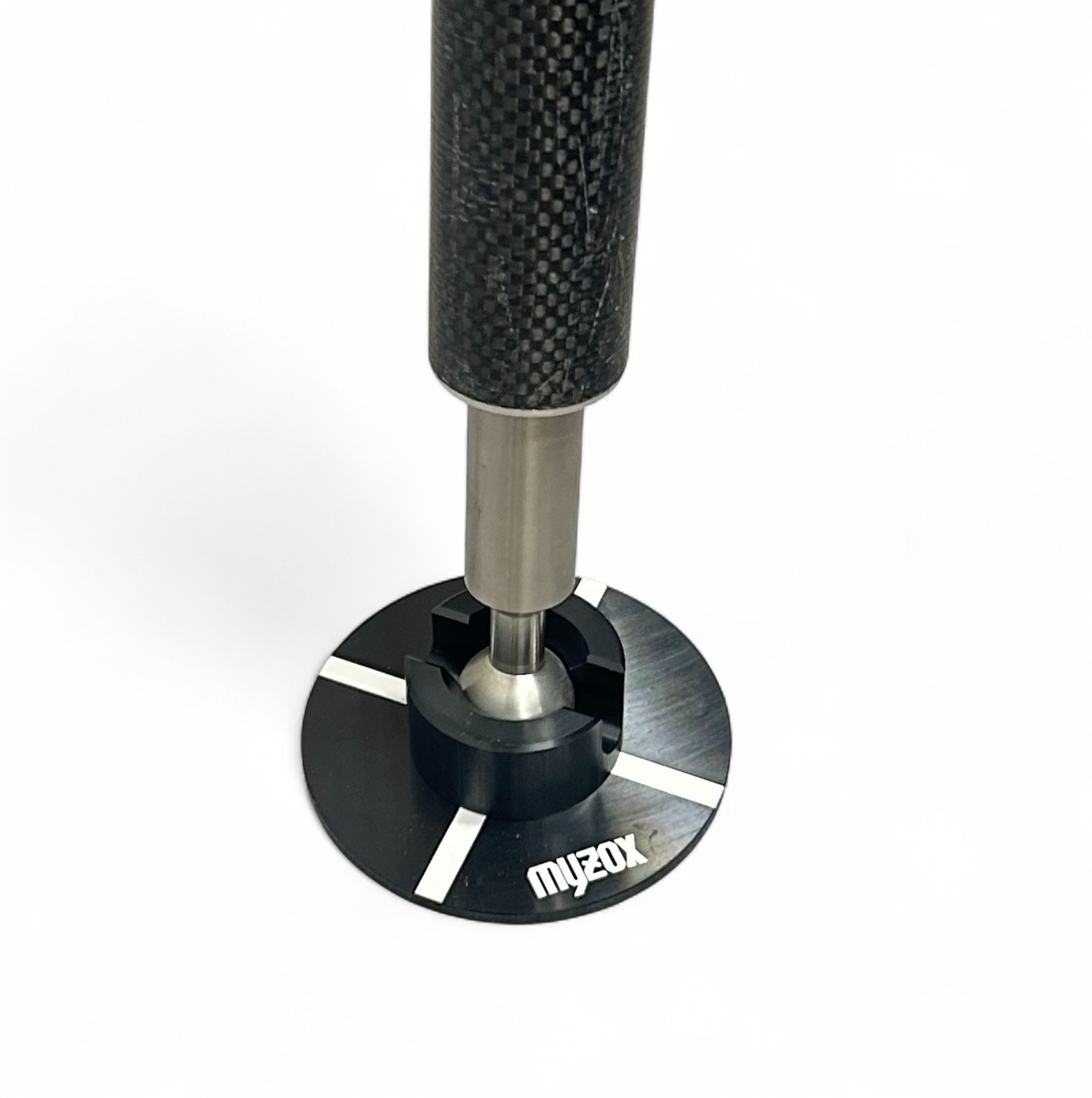Hrot na tyčku s podstavcem a otčným adaptérem od firmy Myzox. Umožňuje tyčku naklopit až do úhlu 90° - vhodný do svažitých terénů.